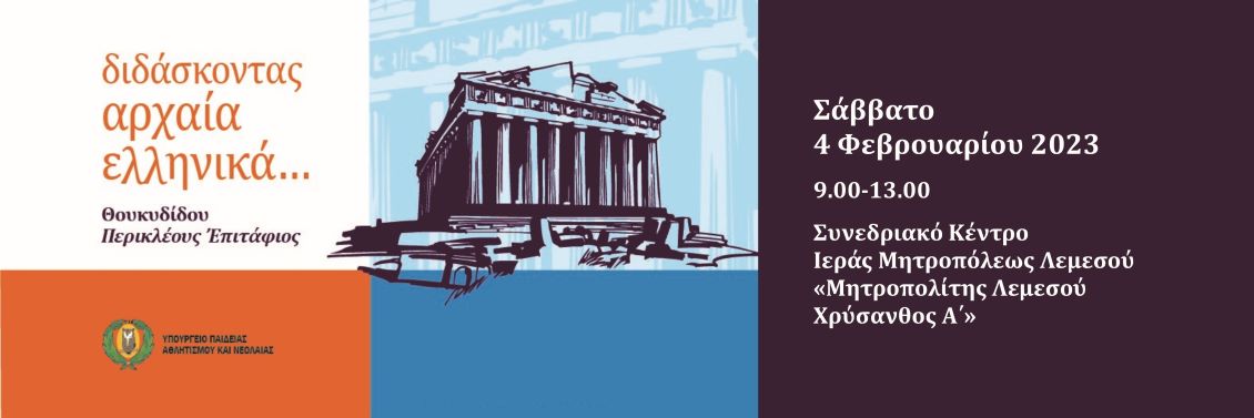 Το Σάββατο, 4 Φεβρουαρίου 2023, πραγματοποιήθηκε στο Συνεδριακό Κέντρο της Ιεράς Μητροπόλεως Λεμεσού «Μητροπολίτης Λεμεσού Χρύσανθος Α'» η δεύτερη Ημερίδα της σειράς «Διδάσκοντας Αρχαία Ελληνικά...», με θέμα τον Θουκυδίδου "Περικλέους Ἐπιτάφιο". Η Ημερίδα διοργανώθηκε από την Ομάδα Αναλυτικών Προγραμμάτων του μαθήματος των Αρχαίων Ελληνικών της Διεύθυνσης Μέσης Γενικής Εκπαίδευσης του Υπουργείου Παιδείας, Αθλητισμού και Νεολαίας και απευθυνόταν σε όλους/όλες τους/τις Φιλολόγους και, ειδικότερα, σε όσους/όσες διδάσκουν το μάθημα της Αρχαίας Ελληνικής Γλώσσας και Γραμματείας, καθώς και σε όσους/όσες αγαπούν τα Αρχαία Ελληνικά. Στόχος της Ημερίδας ήταν η διασύνδεση της διδακτικής πράξης με τον πλέον επικαιροποιημένο επιστημονικό λόγο, ώστε να ενισχυθεί το έργο των εκπαιδευτικών.